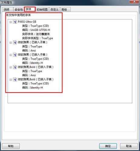 1.我们先用Adobe acrobat (下载地址https://pan.baidu.com/s/1c3CFiaG 密码:5tpa)打开要转曲的文件 然后菜单栏 文件-属性-切换到字体选项卡,我们先看一下文件是不是内嵌了字体,如下图: