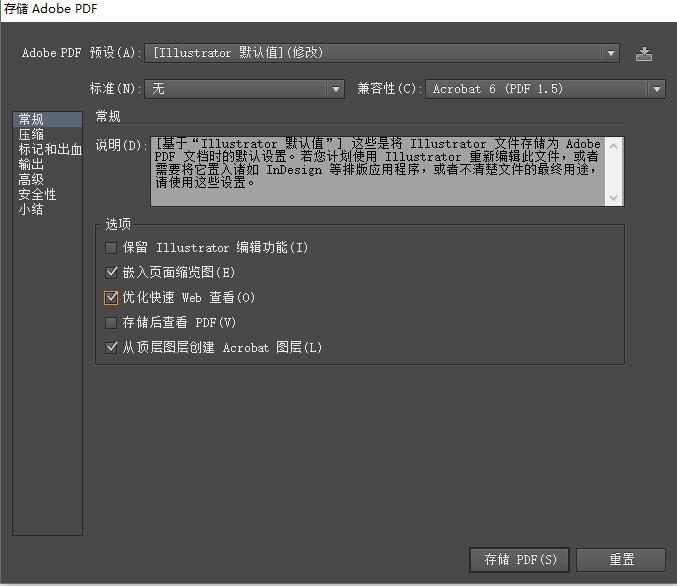 2、(可选)在“存储 Adobe PDF”对话框左边的窗格中选择“一般”,以便设置一般 PDF 文件存储选项。